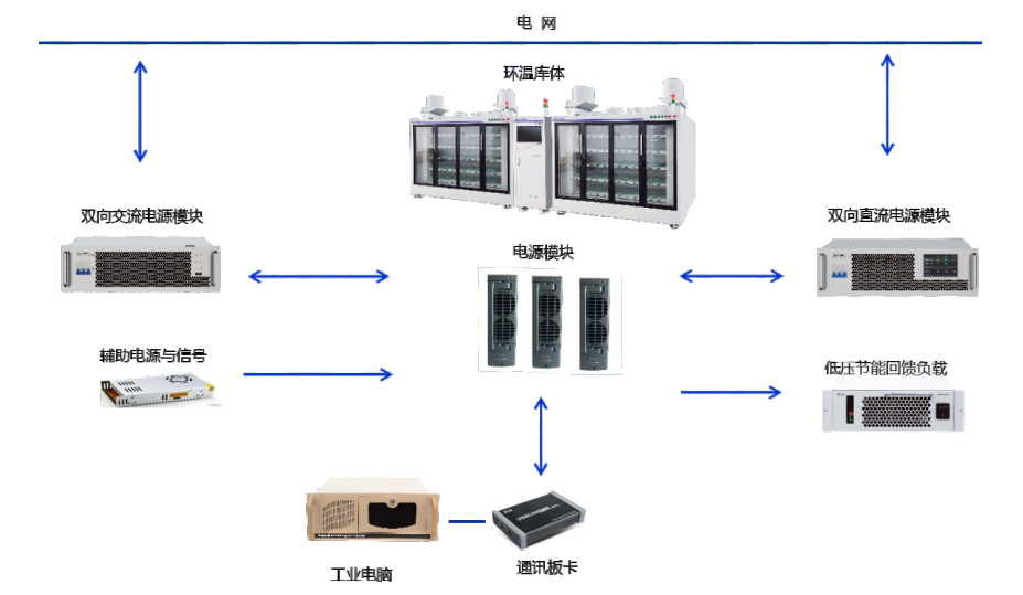 The universal power layer board temperature aging BTS310 integrates ultra-high feedback efficiency high-voltage feedback loads, low-voltage feedback loads, and AC feedback loads, greatly reducing aging energy consumption and saving aging costs. Support bidirectional power module source load integrated mode, support unidirectional and bidirectional aging modes, configure independent communication function modules, support one-to-one communication control, and truly restore the aging of actual work scenarios. Support customer customization of parameters such as ambient temperature, refrigerant temperature, refrigerant flow rate, refrigerant pressure, etc., to meet the aging needs of different users and have a wide coverage range. The aging system supports one-to-one data reading and storage, standardized MES function docking module, and data traceability. Applied to durability testing in power product research and development, as well as production aging testing.