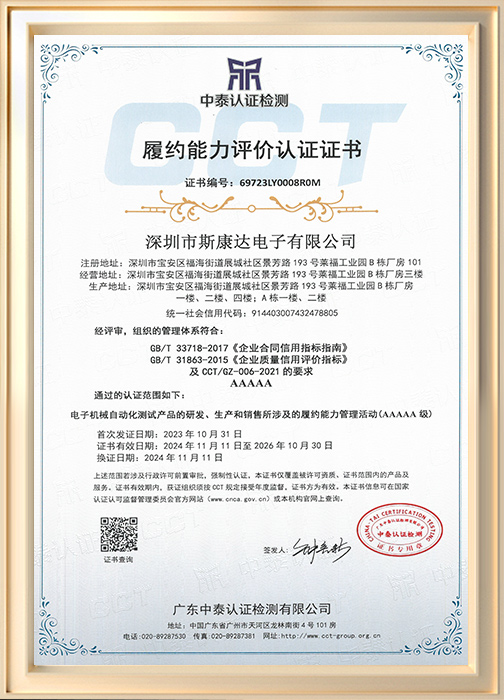 The company adheres to the values of "professional efficiency, quality assurance, trustworthiness, and pursuit of excellence", and is committed to providing high-performance and high reliability testing solutions for global customers. The company strictly implements the requirements of international quality management system standards to ensure that its products can meet the testing needs of global customers. After years of technological accumulation and deep industry cultivation, Skonda has accumulated over 400 product models and 200 testing solutions, with a wide range of product choices that can effectively meet customer needs.