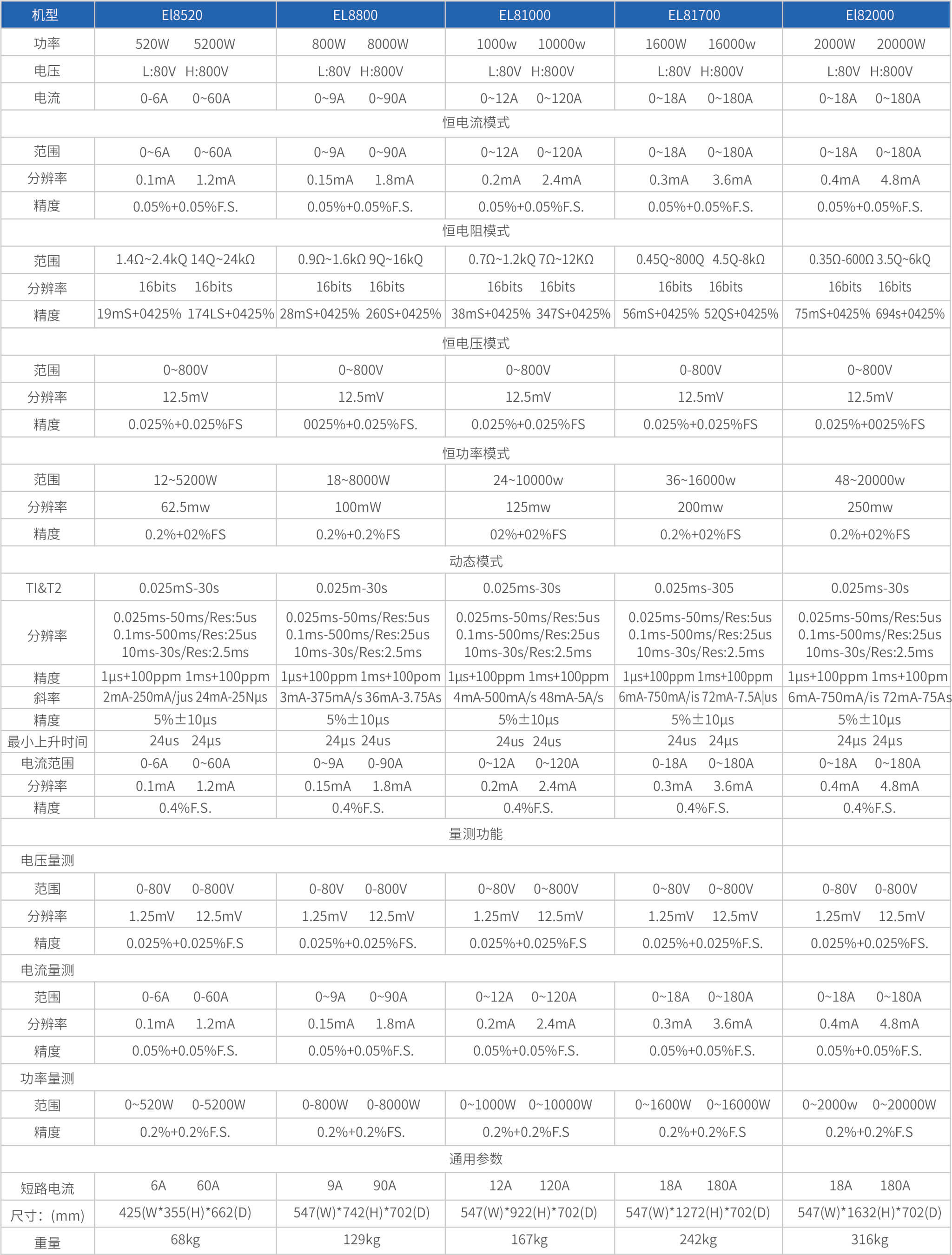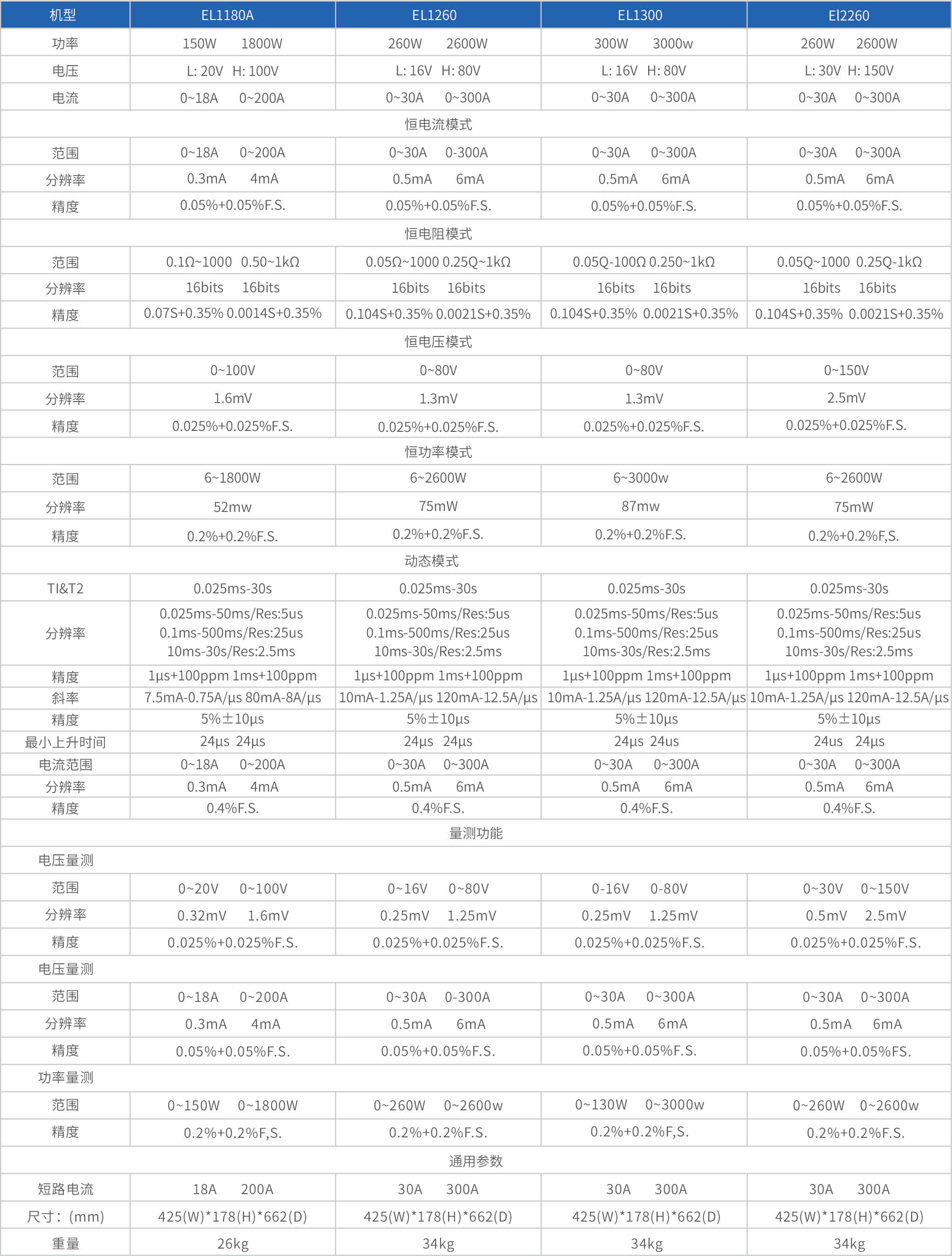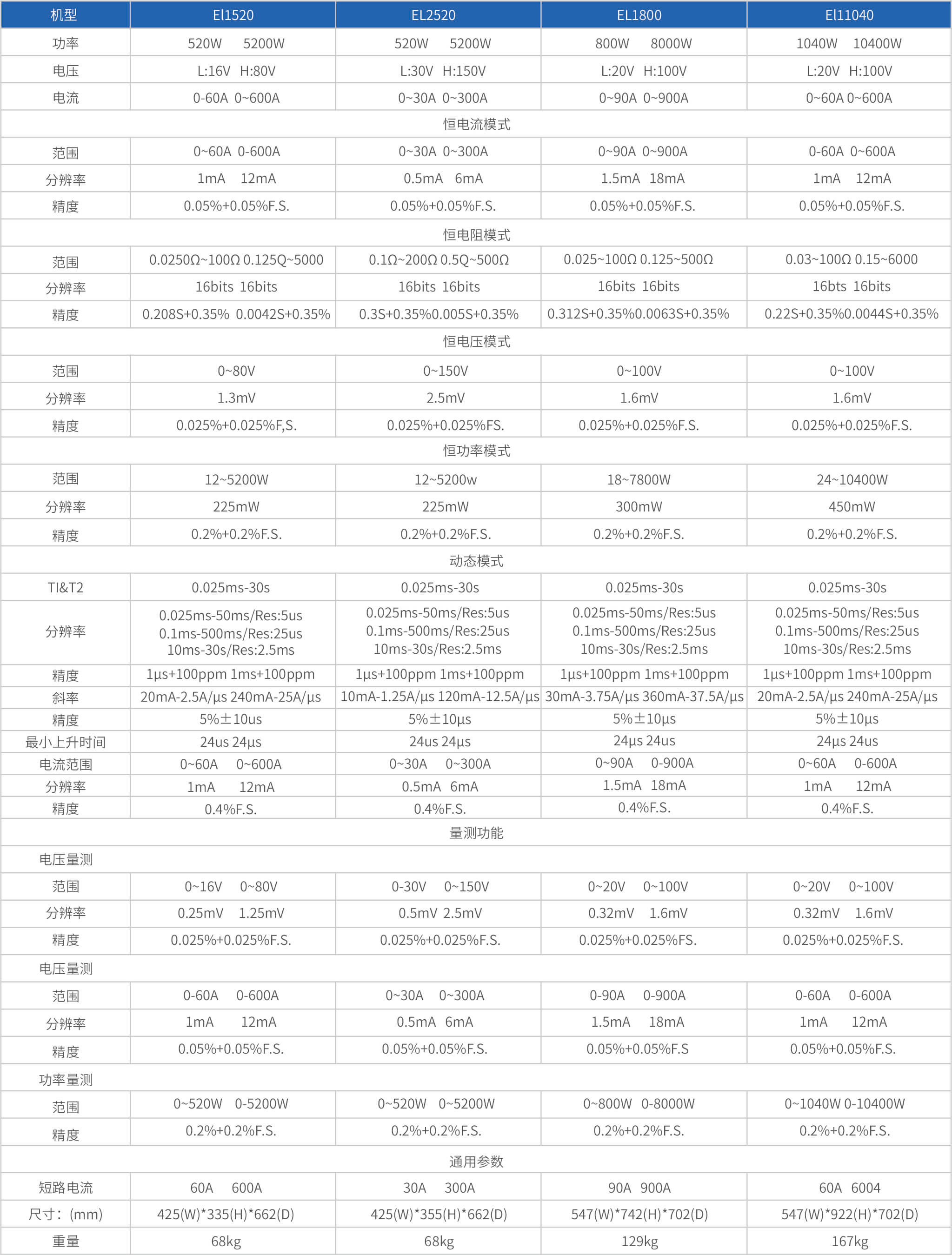 • Four static loading modes: constant voltage, constant current, constant resistance, and constant power