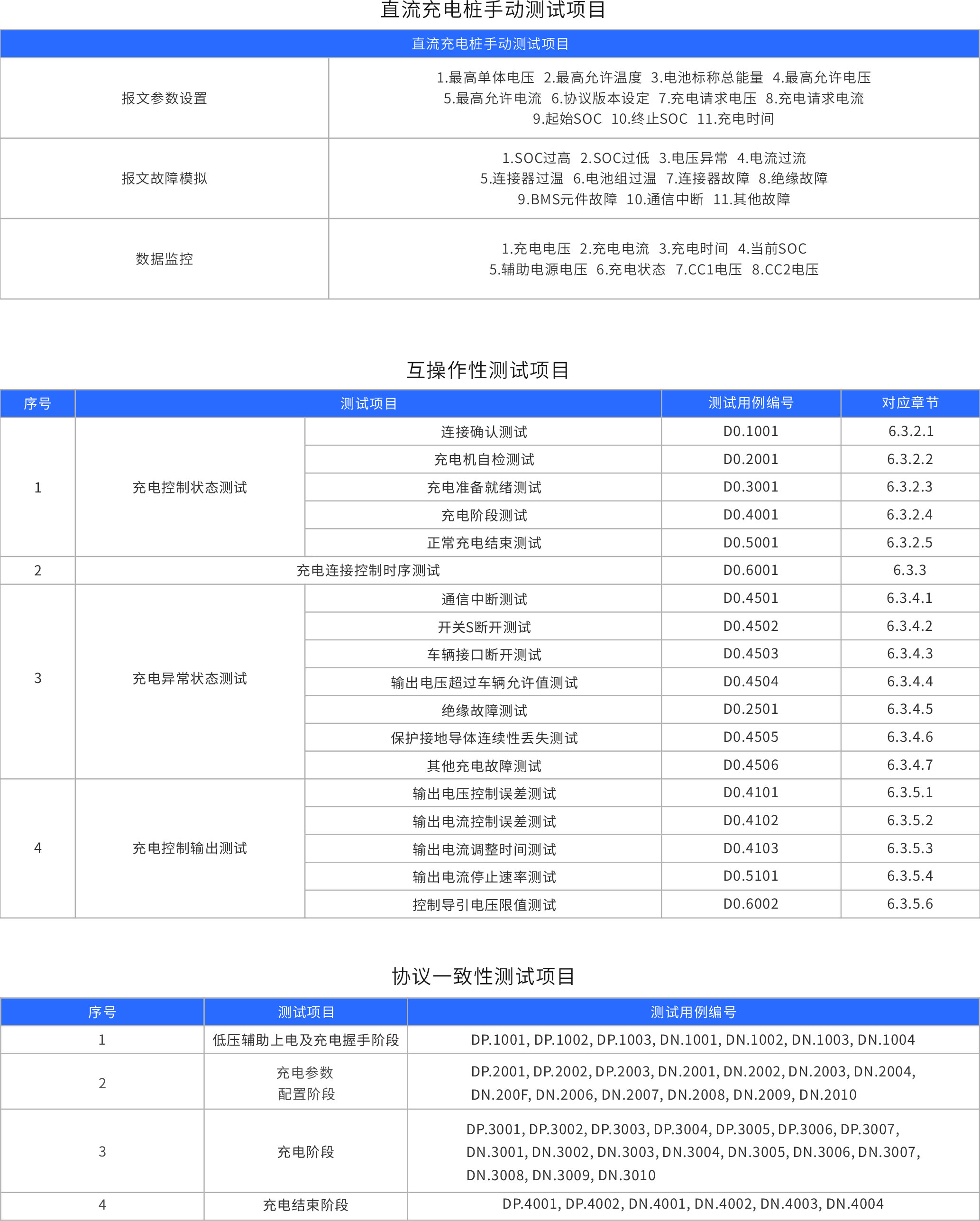 • Built in interoperability test cases for power supply equipment as described in GB/T34657.1-2017 and communication protocol consistency test cases for charging machines as described in GB/T34658-2017 can be completed in conjunction with the testing system.