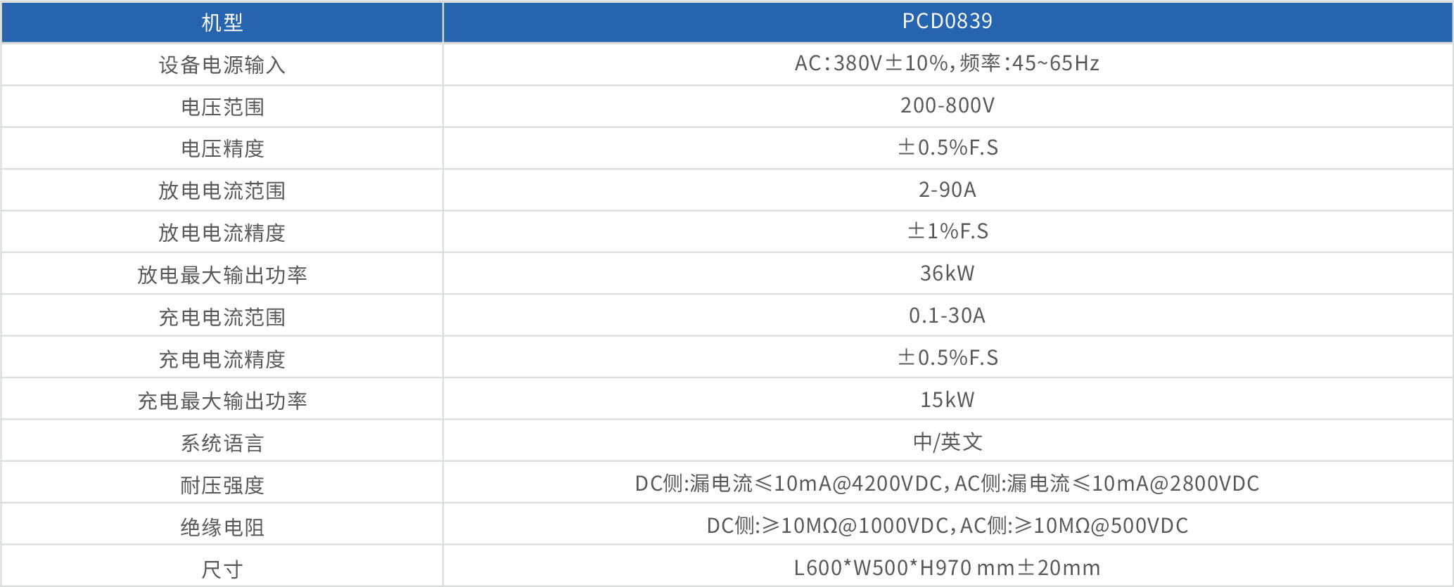 PCD0839 is a power battery pack maintenance device that integrates charging and discharging functions for new energy vehicle batteries. The equipment adopts advanced instrument technology and power electronics technology to develop charging and discharging modules; Adopting powerful data management functions and rich network interfaces of intelligent systems, monitoring data is automatically recorded, stored, and transmitted. In response to the transportation requirements of power battery packs, a fast discharge function can be provided for power battery packs; In response to the storage requirements of power battery packs, the function of restoring and activating the capacity of power battery packs can be provided.