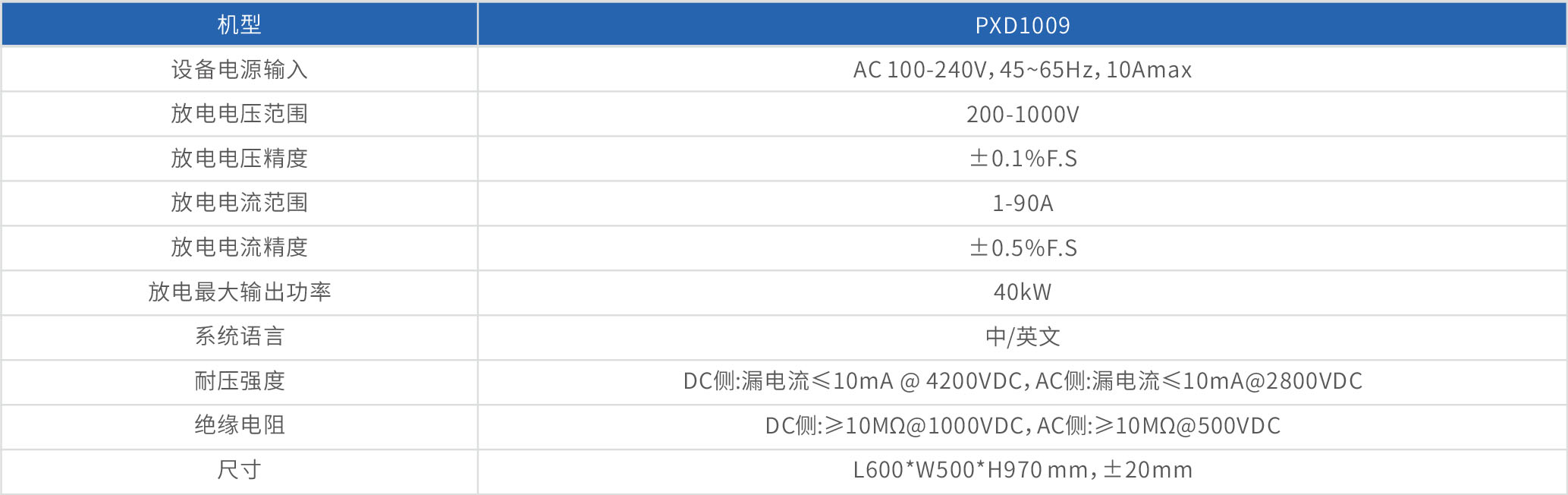 PXD1009 is a power battery pack discharge device used for the discharge function of new energy vehicle batteries. The equipment adopts advanced power electronics technology to develop DC/DC converters and resistor boxes as discharge modules, which have the characteristics of high control accuracy, wide discharge voltage range, and continuously adjustable discharge current curve. Adopting powerful data management functions and rich network interfaces of intelligent systems, monitoring data is automatically recorded, stored, and transmitted. Provide fast discharge function for power battery pack transportation scenarios.