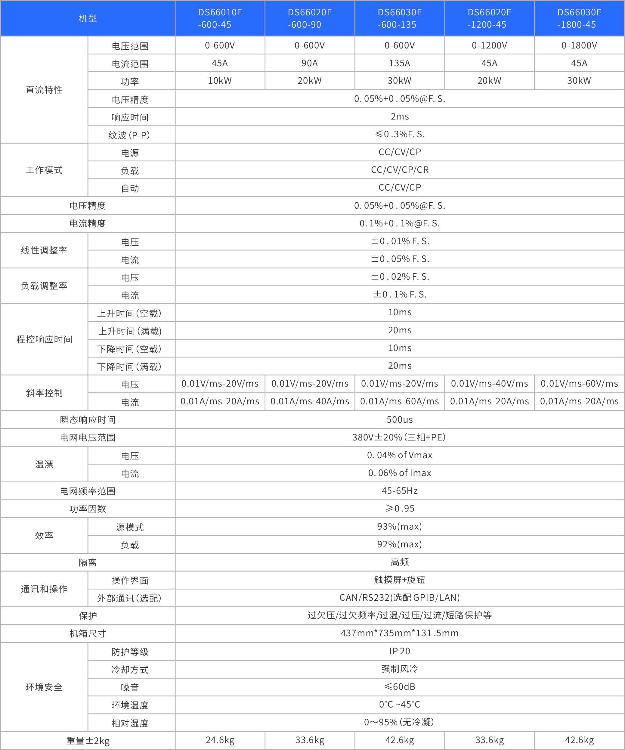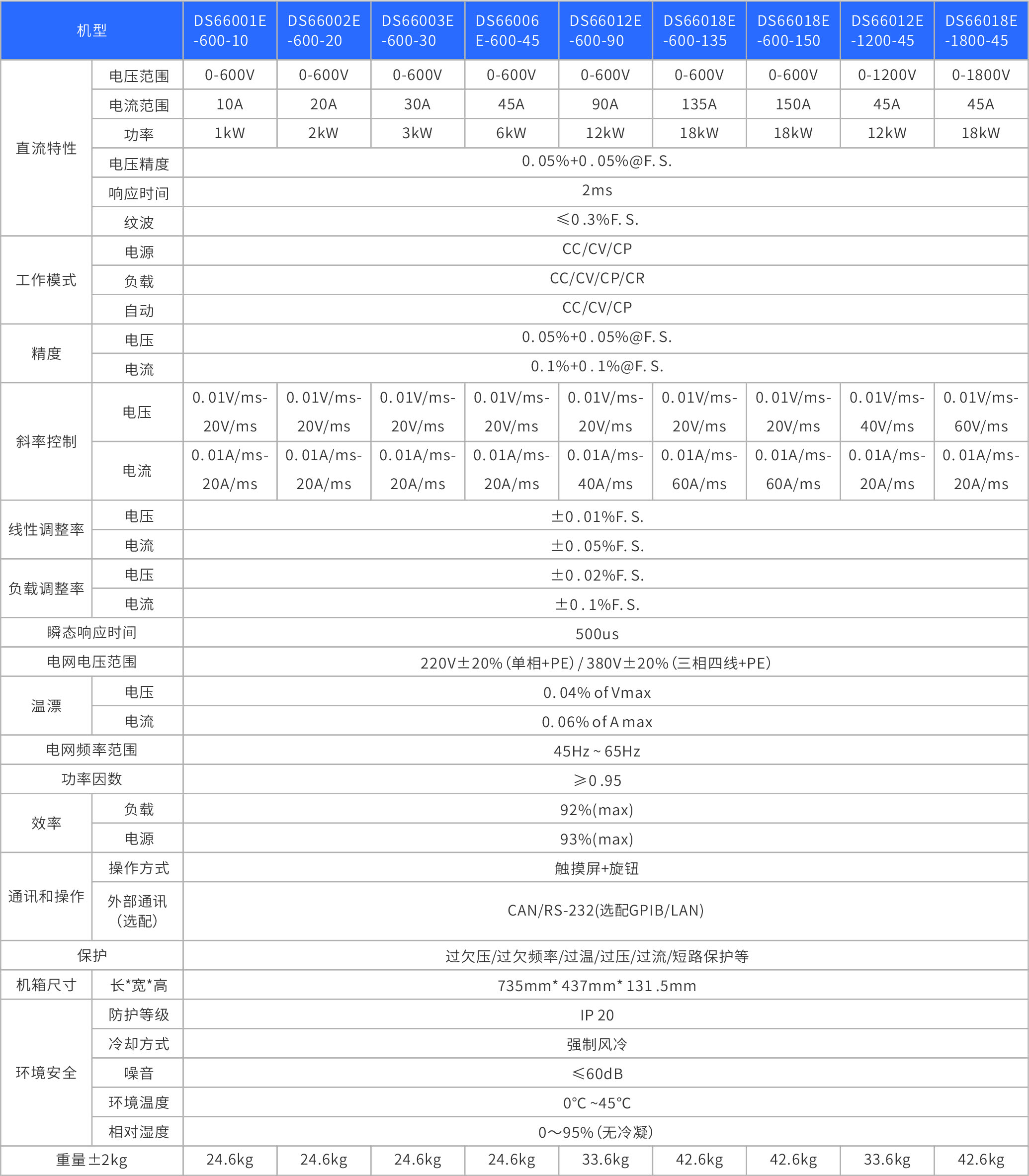 The DS66000 series bidirectional DC power supply is a power supply that combines power supply and regenerative load characteristics, operates in two quadrants, and allows energy input of the tested object. This series can meet the testing needs of different products such as high voltage, low current, low voltage, and high current to the maximum extent. Multiple control modes can be selected, supporting digital RS232/LAN/GPIB/CAN communication interfaces. It is a versatile, high-performance, and widely applicable bidirectional DC power supply.