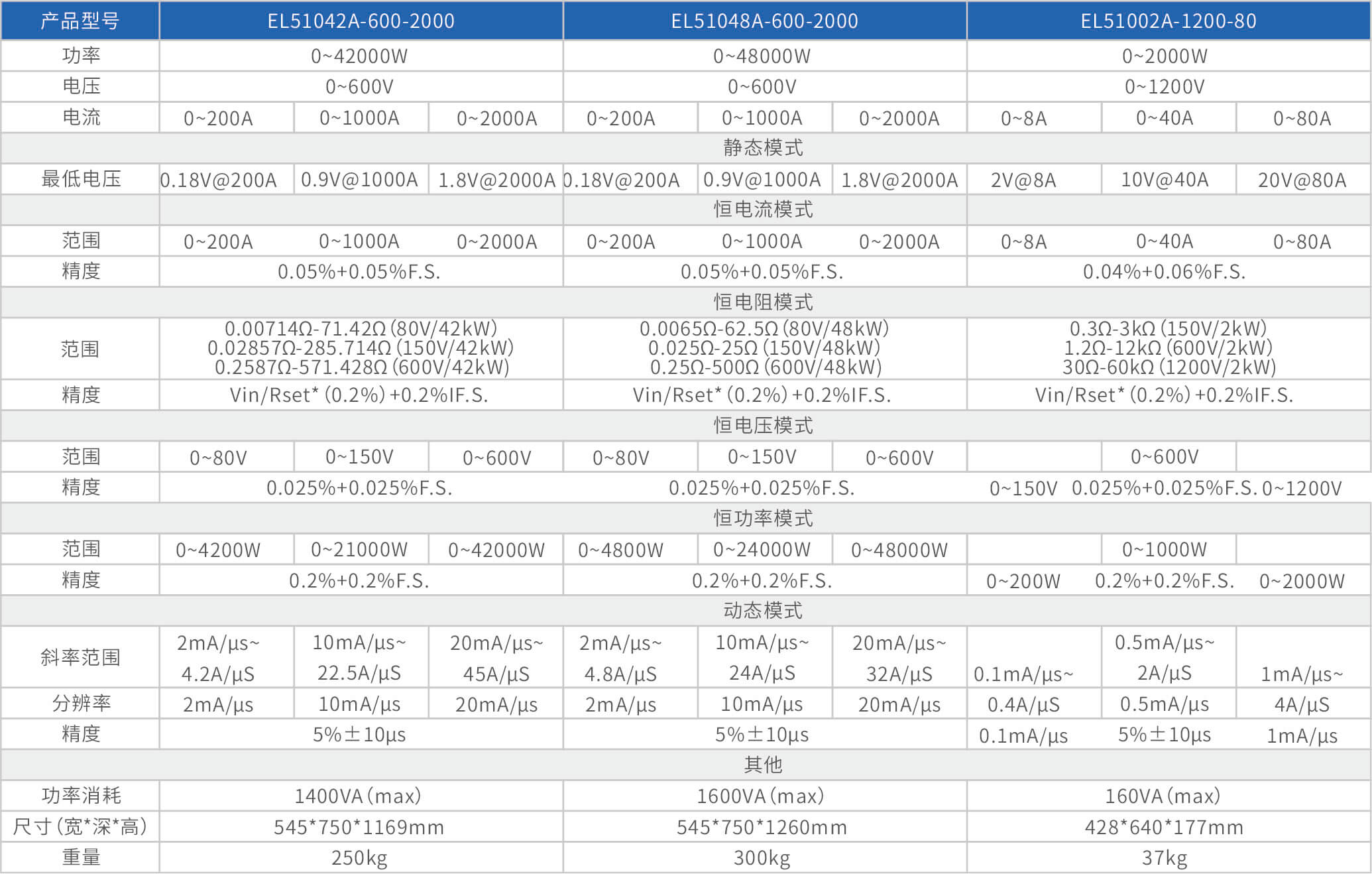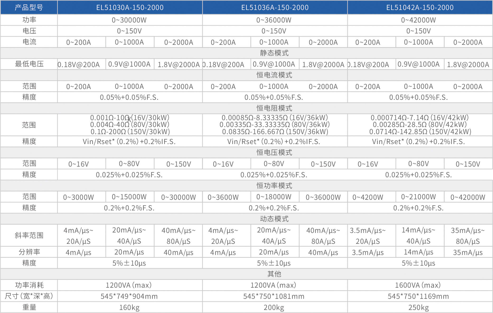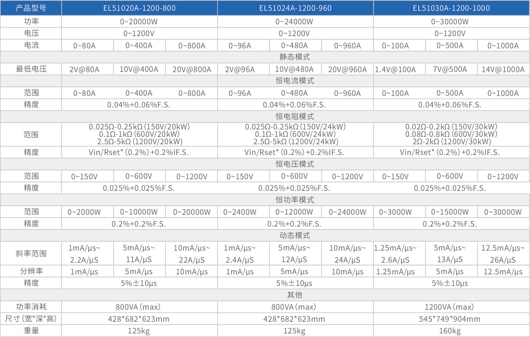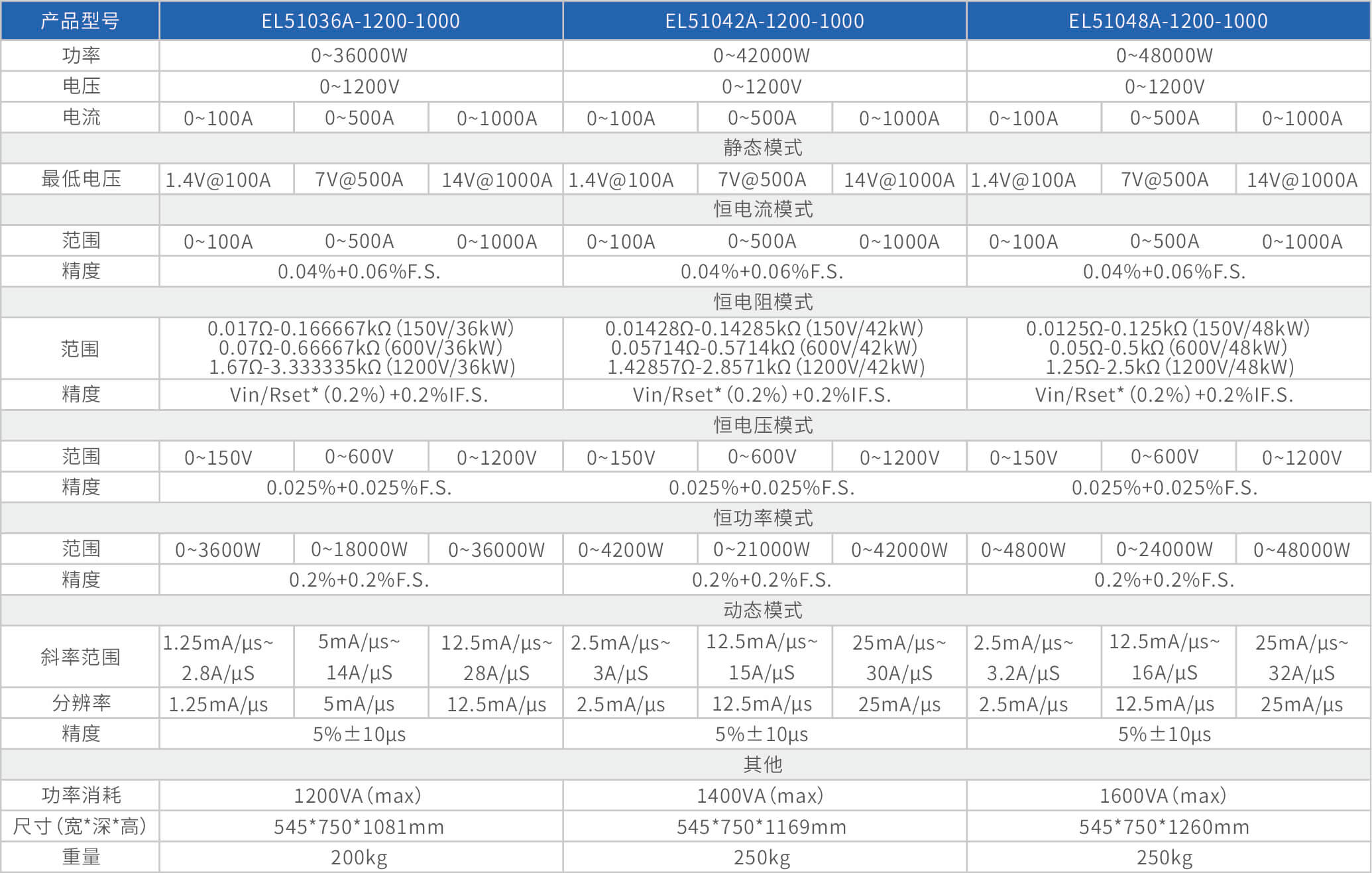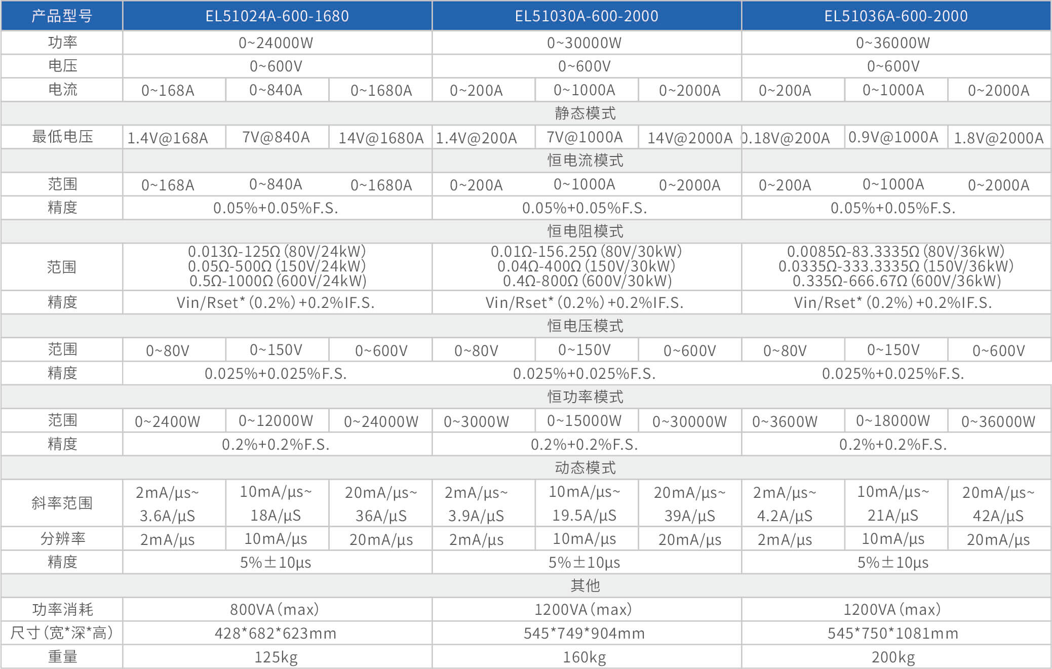 The high-precision electronic load EL51000A series has three voltage ranges of 150V, 600V, and 1200V, with a power range of 2kW to 48kW. The maximum current of a single unit can reach 2000A, and through parallel expansion, the maximum power can reach 480kW. The EL51000A series load has the characteristics of high power density, high control and measurement accuracy, and high cost-effectiveness; At the same time, this series of loads has synchronous dynamic and parallel expansion functions, as well as instant triple rated power function, supporting four traditional static loading modes of constant voltage CV, constant current CC, constant resistance CR, and constant power CP, as well as three composite loading modes of CV+CC, CR+CC, and CV+CR.