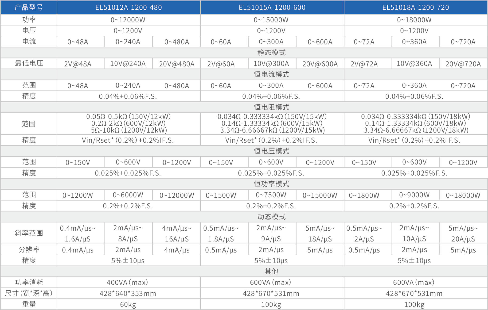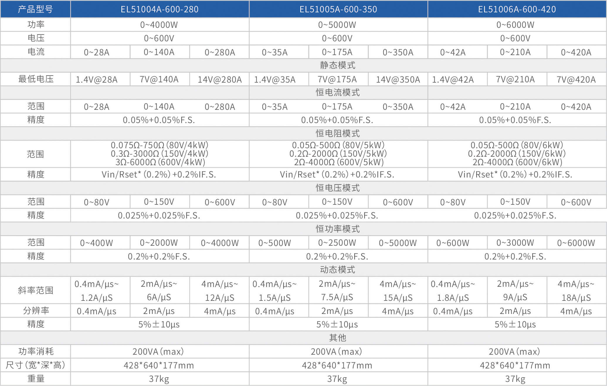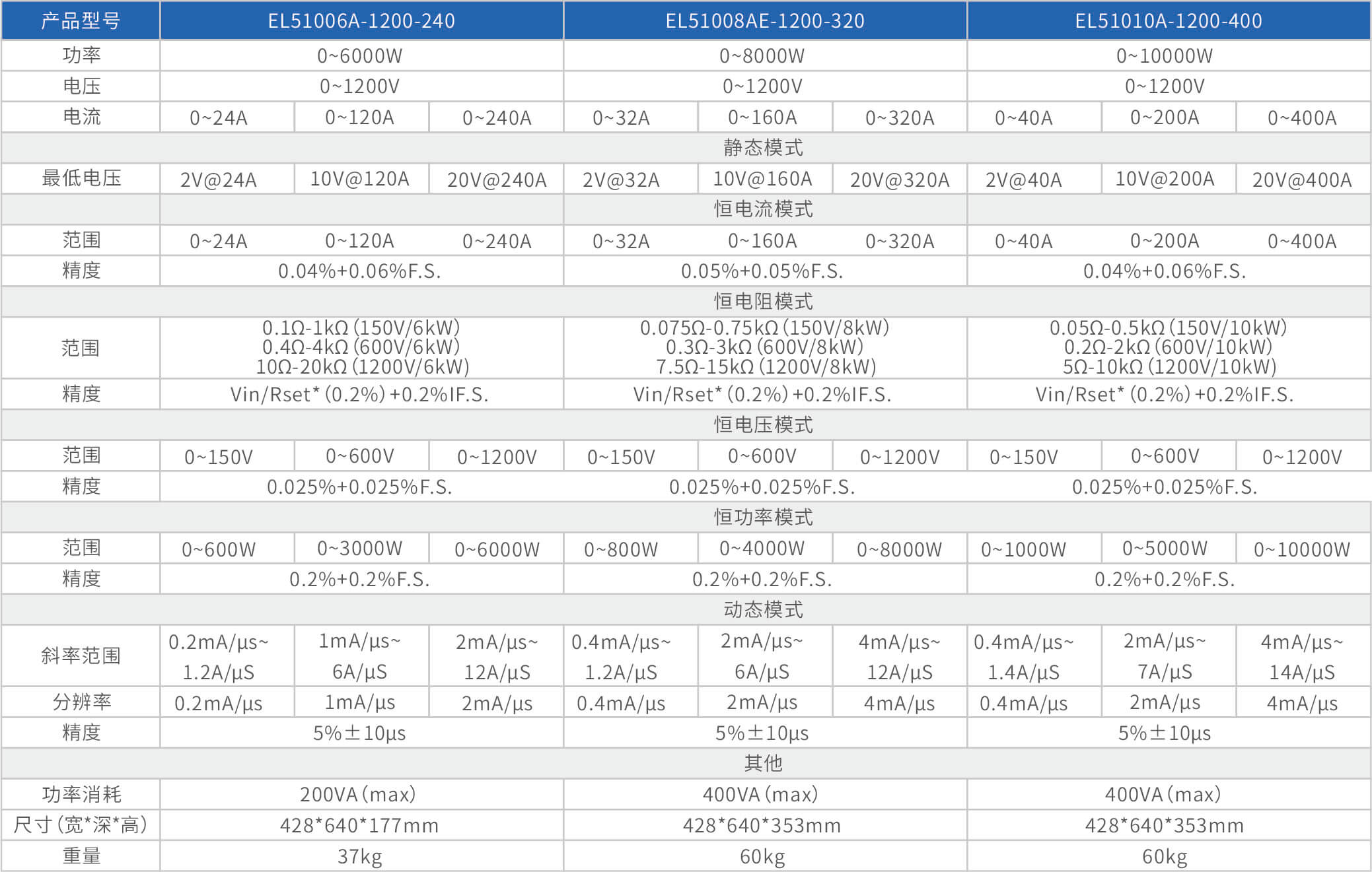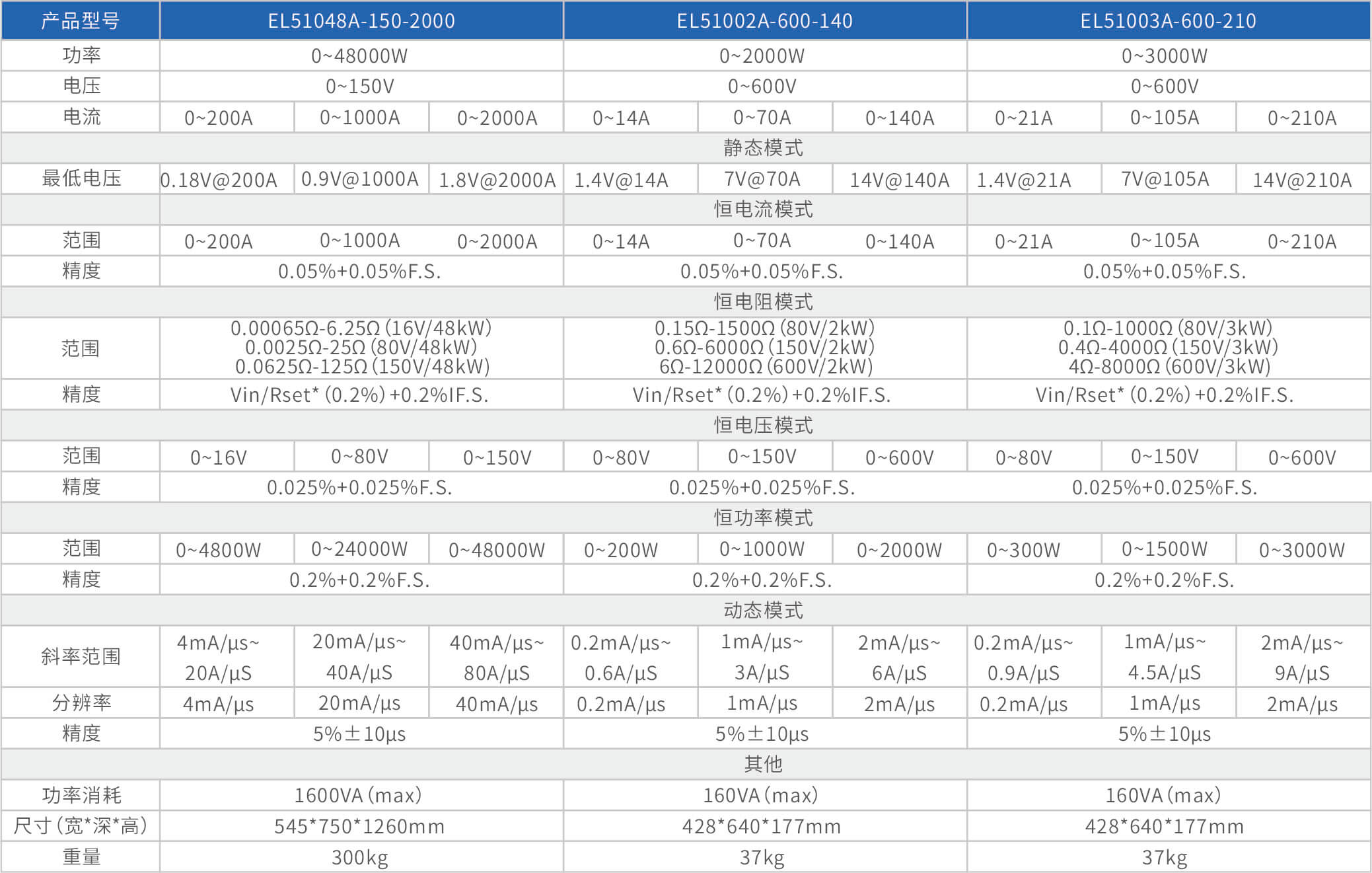 The high-precision electronic load EL51000A series has three voltage ranges of 150V, 600V, and 1200V, with a power range of 2kW to 48kW. The maximum current of a single unit can reach 2000A, and through parallel expansion, the maximum power can reach 480kW. The EL51000A series load has the characteristics of high power density, high control and measurement accuracy, and high cost-effectiveness; At the same time, this series of loads has synchronous dynamic and parallel expansion functions, as well as instant triple rated power function, supporting four traditional static loading modes of constant voltage CV, constant current CC, constant resistance CR, and constant power CP, as well as three composite loading modes of CV+CC, CR+CC, and CV+CR.