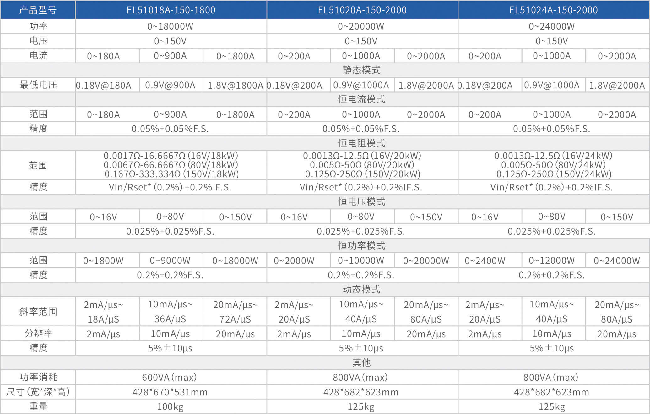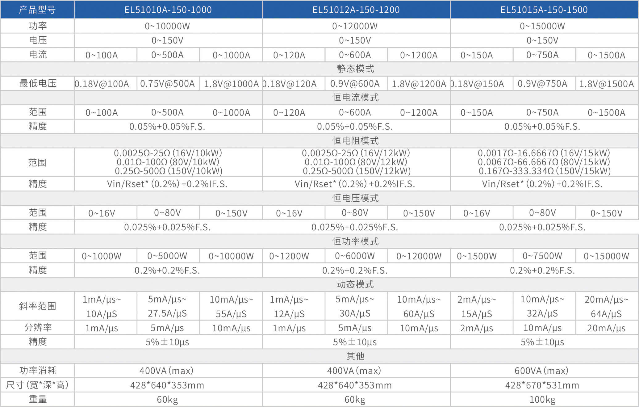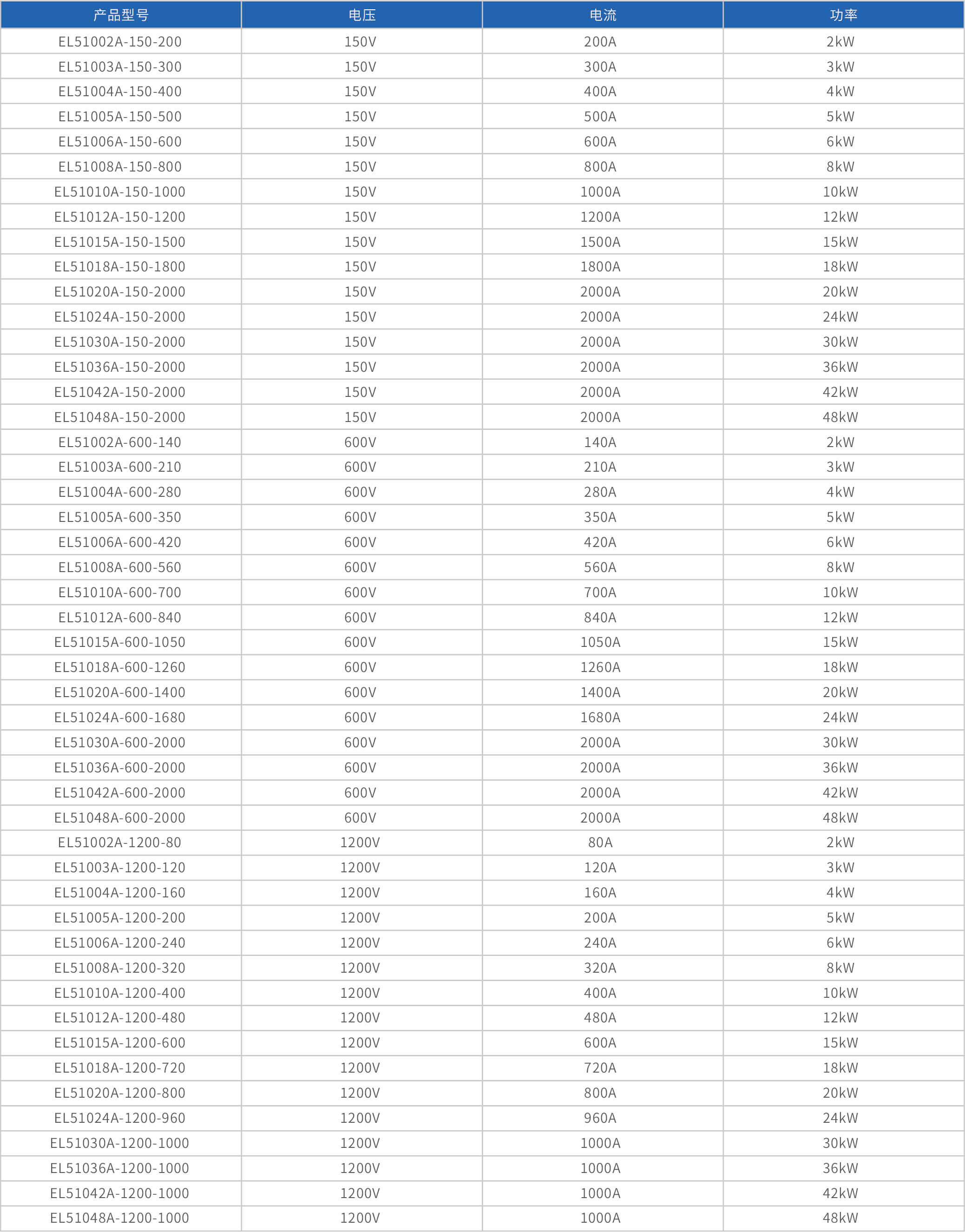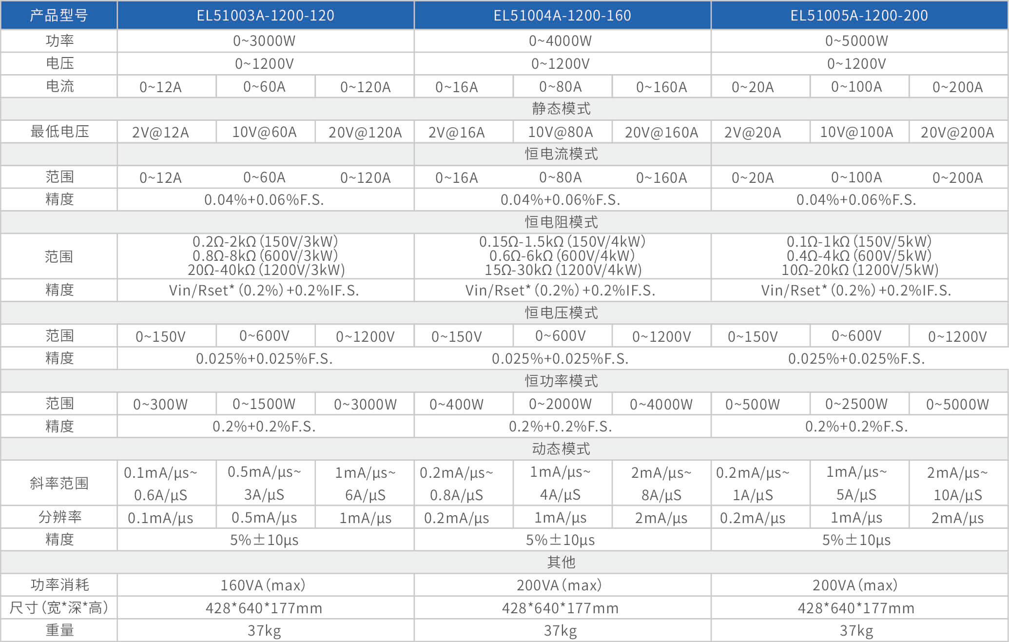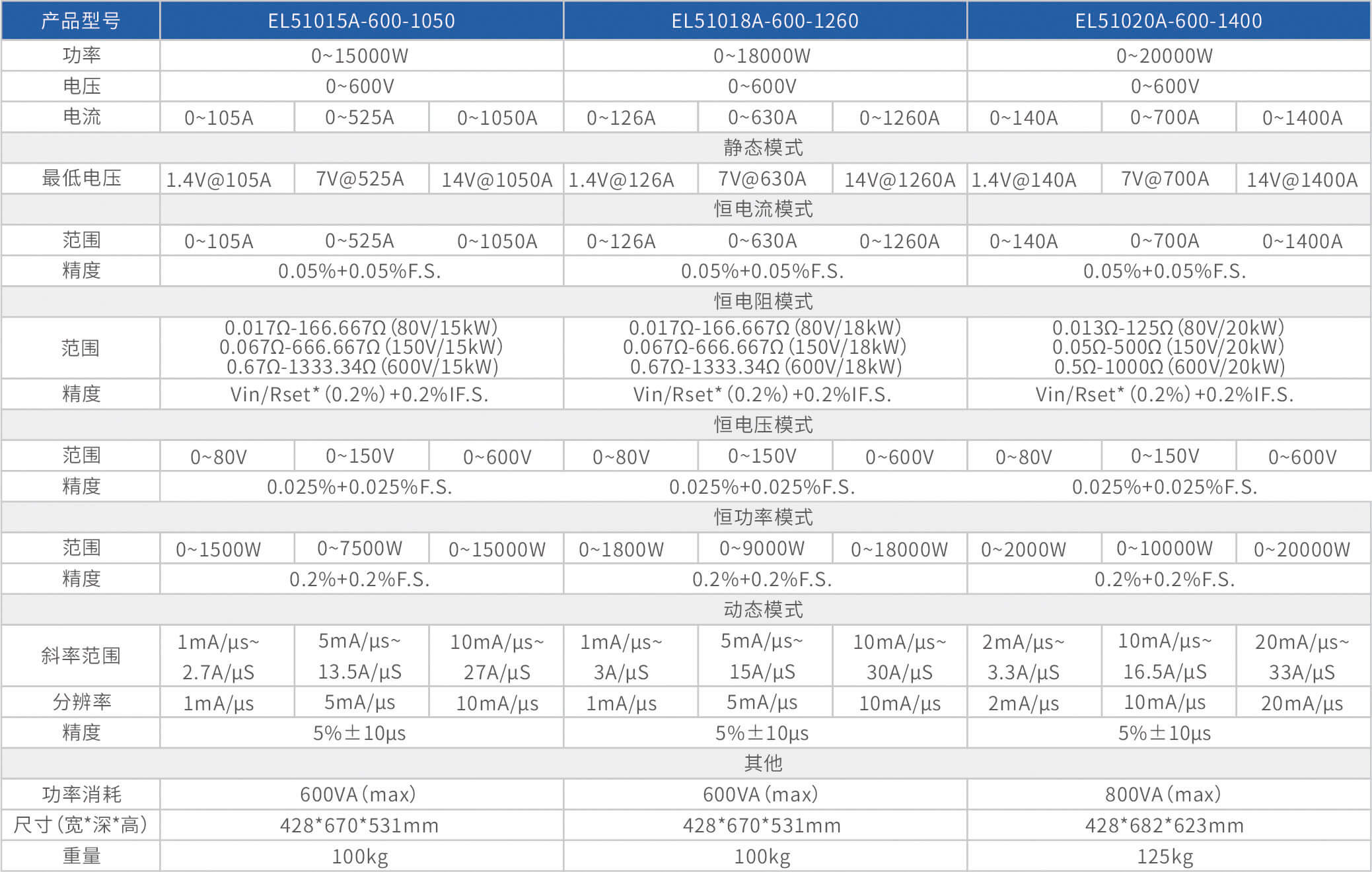 The high-precision electronic load EL51000A series has three voltage ranges of 150V, 600V, and 1200V, with a power range of 2kW to 48kW. The maximum current of a single unit can reach 2000A, and through parallel expansion, the maximum power can reach 480kW. The EL51000A series load has the characteristics of high power density, high control and measurement accuracy, and high cost-effectiveness; At the same time, this series of loads has synchronous dynamic and parallel expansion functions, as well as instant triple rated power function, supporting four traditional static loading modes of constant voltage CV, constant current CC, constant resistance CR, and constant power CP, as well as three composite loading modes of CV+CC, CR+CC, and CV+CR.