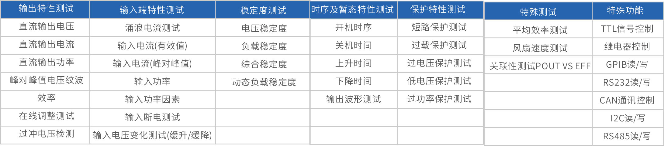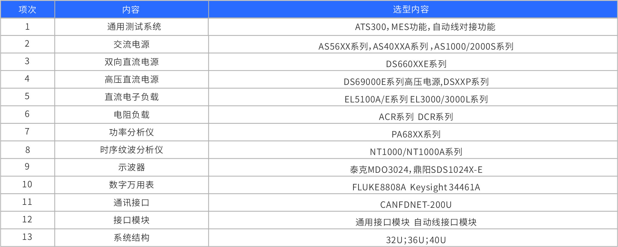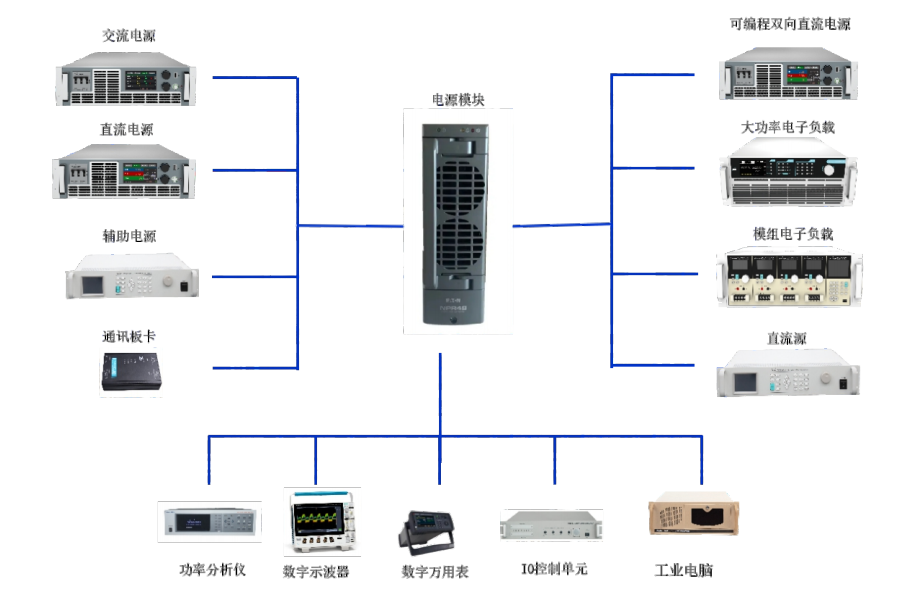 The universal power function testing system ATS310 is suitable for automated testing of various power supplies, providing various hardware options for devices, integrating AC power supplies, DC power supplies, power analyzers, timing/noise analyzers, oscilloscopes, etc. Combined with the modular testing system platform ATS300, it provides users with open and flexible applications, powerful functions, saves labor costs, improves product quality, and can meet any form of power testing needs. Different power level devices can be selected according to power, supporting various power products. Its open modular functional design can meet various testing needs for production, research and development, and quality.