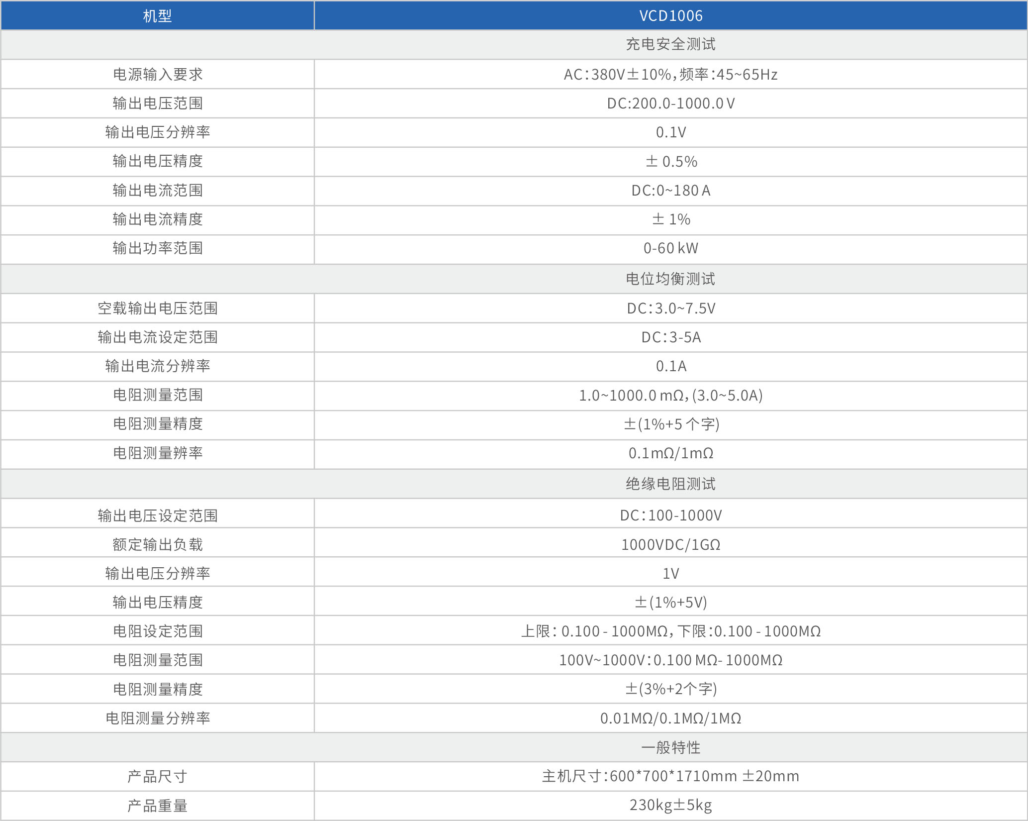 VCD1006 is a new energy vehicle charging and diagnostic electrical safety tester developed and designed to meet the requirements of GBT44500 standard. It integrates functions such as charging safety, potential balancing, insulation resistance detection, and diagnosis for new energy vehicles.